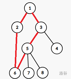 cout< return 0; } ``` ## 例题 2 [P3629](https://www.luogu.com.cn/problem/P3629)。 ### 思路 这道题挺绕的,~~出题人吃枣药丸~~,说白了就是**在一颗树里找选 K 条路径,让它们不相交部分的长度最大**。 本题突破点在于 $1\le K \le 2$,所以我们只需要分类讨论一下。 #### K=1 拿原题里的图举例  我们从节点 $1$ 出发,遍历整棵树,一开始每条边需要遍历 $2$ 次,即巡逻距离为 $2\times (n-1)$。 为了使巡逻距离变短,我们可以通过连接两个节点形成一条新的边,那么连什么边才能减少最多距离呢? 修建一条道路后,这棵树里就出现了一个环,我们定义 $S(x,y)$ 的为从 $x$ 到 $y$ 的距离,比如上面的图中 $S(1,6)=3$,我们从 $x$ 走到 $y$ 后,要再回到 $x$,这时如果我们在 $x$ 和 $y$ 之间连一条边,就可以减少 $(S(x,y)-1)$ 的距离,$-1$ 是因为要走新加的一条边,不难发现 $S(x,y)$ 的最大值就是**树的直径**的长度。 所以当 $K=1$ 时我们只需要找出树的直径并将其**首尾相连**即可得到答案,答案是 $(2\times n-L-1)$。 #### K=2 推完 $K=1$ 的情况,我们继续推 $K=2$ 的情况,经过第一次处理,我们的图变成了这样。  其中红色边是加入新的边之后形成的环。 但是我们需要再添加一条边,但是如果这两个点之间的路径与原先形成的环有重复的话,重复的部分就会计算两次,所以我们要令**不重叠的部分**长度最大。 题目原理就是这样,但是怎么去求第二条边缩减小的代价呢?我们可以将这个环上的边权改为 $-1$,再跑一次求直径,但是因为存在负边权,所以要用**树状 DP** 求。 ### 代码: ```cpp #include #define int long long #define endl "\n" using namespace std; int n,k,c,d[100005],fat[100005],fath[100005]; int f[100005],f1[100005],f2[100005]; int head,tail; int ans; vector void dfs(int u,int fa) { for(auto x:e[u]) { int v=x.first,w=x.second; if(v==fa)continue; d[v]=d[u]+w; if(d[v]>d[c])c=v; dfs(v,u); } } void dfs2(int u,int fa) { for(auto x:e[u]) { int v=x.first,w=x.second; if(v==fa)continue; fat[v]=u; d[v]=d[u]+w; if(d[v]>d[c])c=v; dfs2(v,u); } } void dfs3(int u,int fa) { f1[u]=f2[u]=0; for(auto i:e[u]) { int v=i.first,w=i.second; if(v==fa)continue; dfs3(v,u); int t=f1[v]+w; if(t>f1[u]) { f2[u]=f1[u]; f1[u]=t; } else if(t>f2[u]) { f2[u]=t; } } f[u]=f1[u]+f2[u]; ans=max(ans,f[u]); } void dfs4(int u,int fa) { for(int i=0;i { int v=e[u][i].first; if(v==fa||v!=fat[u])continue; fath[v]=u; c=v; e[u][i].second=-1; dfs4(v,u); } } signed main() { // ios::sync_with_stdio(0); // cin.tie(0); // cout.tie(0); cin>>n>>k; for(int i=1;i { int u,v; cin>>u>>v; e[u].push_back({v,1}); e[v].push_back({u,1}); } dfs(1,0); d[c]=0; dfs2(c,0); if(k==1) { cout<<2*n-d[c]-1; return 0; } int an=d[c]; dfs4(c,0); for(int i=1;i<=n;i++)fat[i]=fath[i]; //for(int i=1;i<=n;i++)cout< dfs4(c,0); // for(int i=1;i<=n;i++){ // for(int j=0;j // cout< // cout<<"\n"; // } dfs3(1,0); cout<<2*n-an-ans; //cout< return 0; } ``` ## 常见错误 1. 函数套用错误。 ```cpp void dfs2(int u,int fa) { for(auto x:e[u]) { int v=x.first,w=x.second; if(v==fa)continue; fat[v]=u; d[v]=d[u]+w; if(d[v]>d[c])c=v; dfs1(v,u);//应为 dfs2(v,u) } } ``` 2. $d_c$ 未归零。 ```cpp dfs(1,0); //此处应有 d[c]=0; dfs(c,0); ``` 3. 遍历取最大值时未判断 $i$ 是否是直径两端。 ```cpp for(int i=1;i<=n;i++) { //此处应有 if(i!=first&&i!=last) ma=max(ma,min(d[i],f[i])+k); } ``` ## 结语 终于写完了…… 这个可恶的知识点主打一个算法简单,题目极难,还是要多练习的。 练习题嘛,直接在[洛谷搜一下好了](https://www.luogu.com.cn/problem/list?tag=213)(主要是我搜不到一个题单)。 update:补充证明过程。
