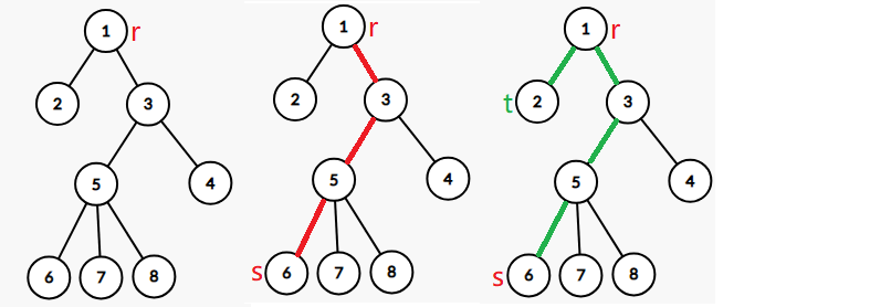 综上,三种情况下均会产生矛盾,则在一棵树上,从任意节点 $r$ 出发进行一次 DFS,到达距离最远的节点一定是书的直径的一个端点。